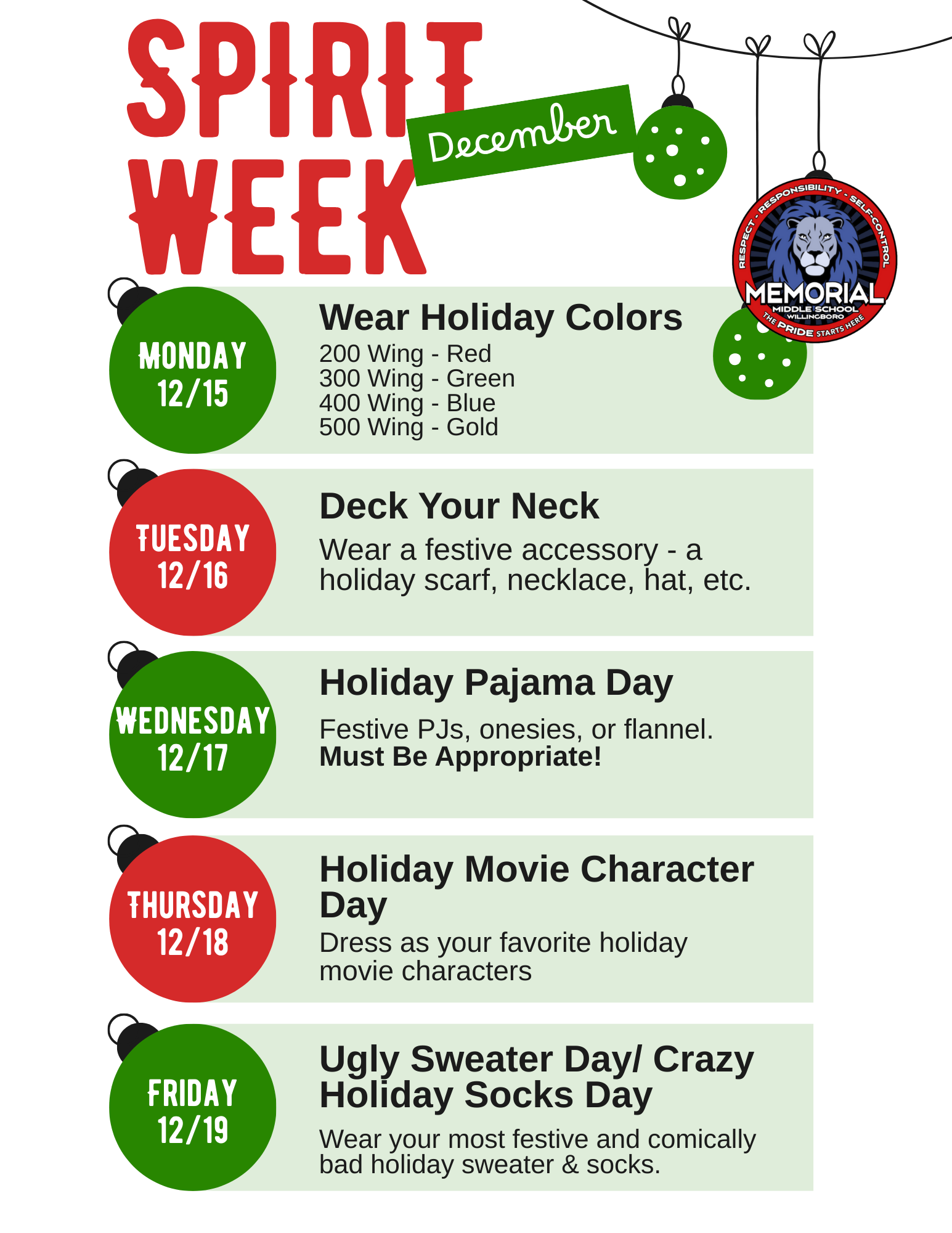 We are excited to kick off Spirit Week this week as we head into the holiday season. Spirit Week is a fun way for students to build community, show school pride, and enjoy the season together. Participation is optional, and all attire should remain school-appropriate and aligned with our dress code.